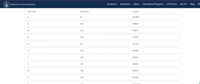 Before calculating your GPA, it helps to understand how the UCP Lahore grading system works. UCP assigns a specific number of grade points to each letter grade. These points, combined with your credit hours, determine your final GPA. Here is the complete ucp grading policy with grade points and corresponding percentage ranges:
